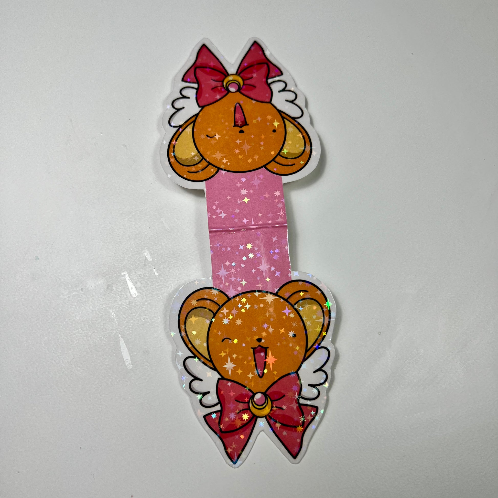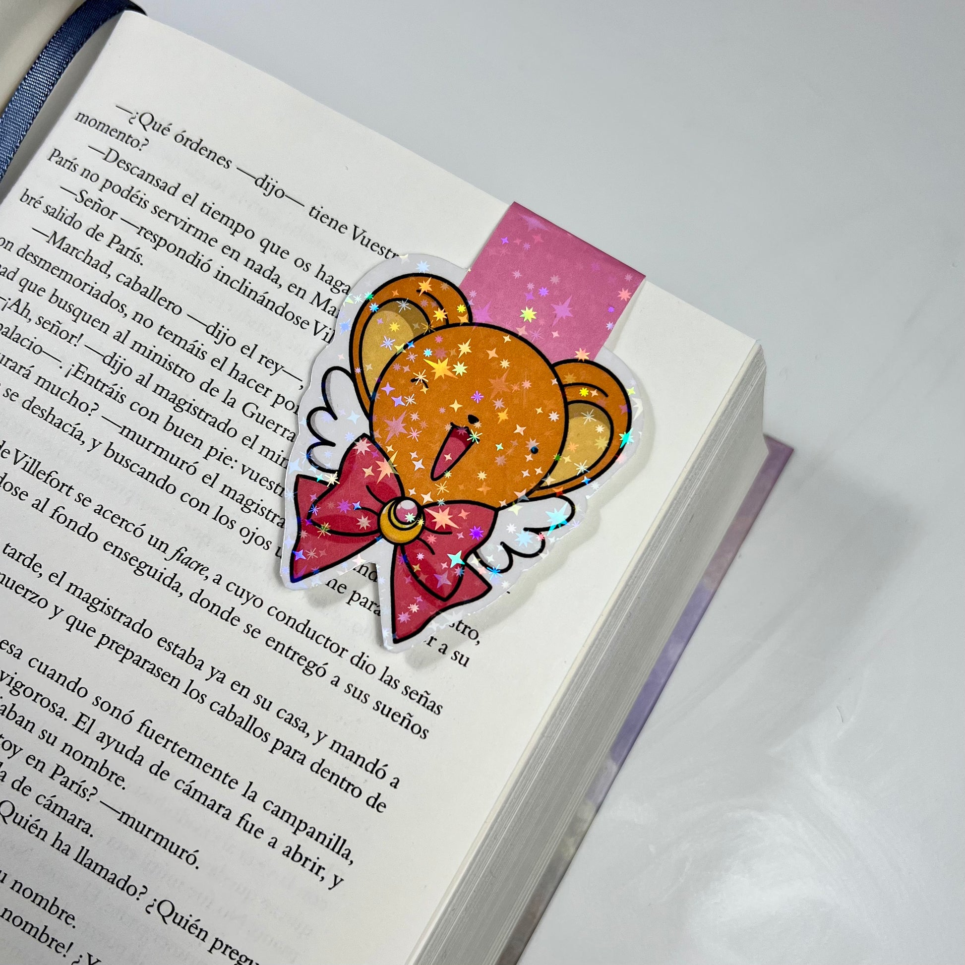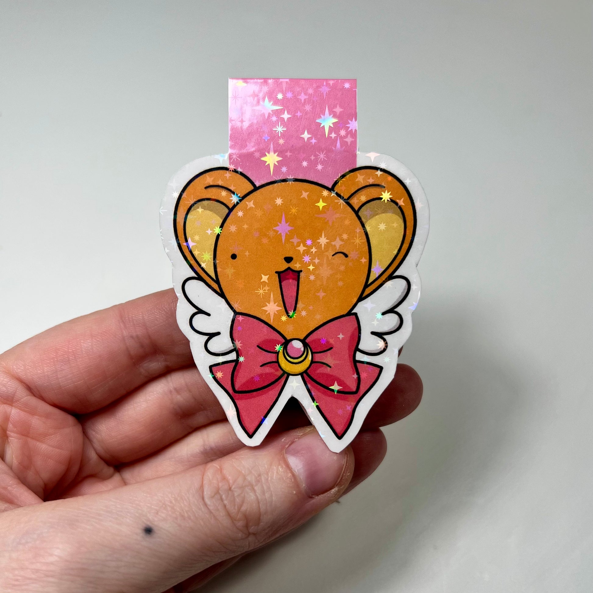 Marca páginas magnético inspirado en la esencia de Kero de Sakura y el lazo de Sailor Moon: un accesorio imprescindible para hacer más mágicas tus lecturas. Impreso sobre papel de alto gramaje y forrado con film holográfico estrellado.
