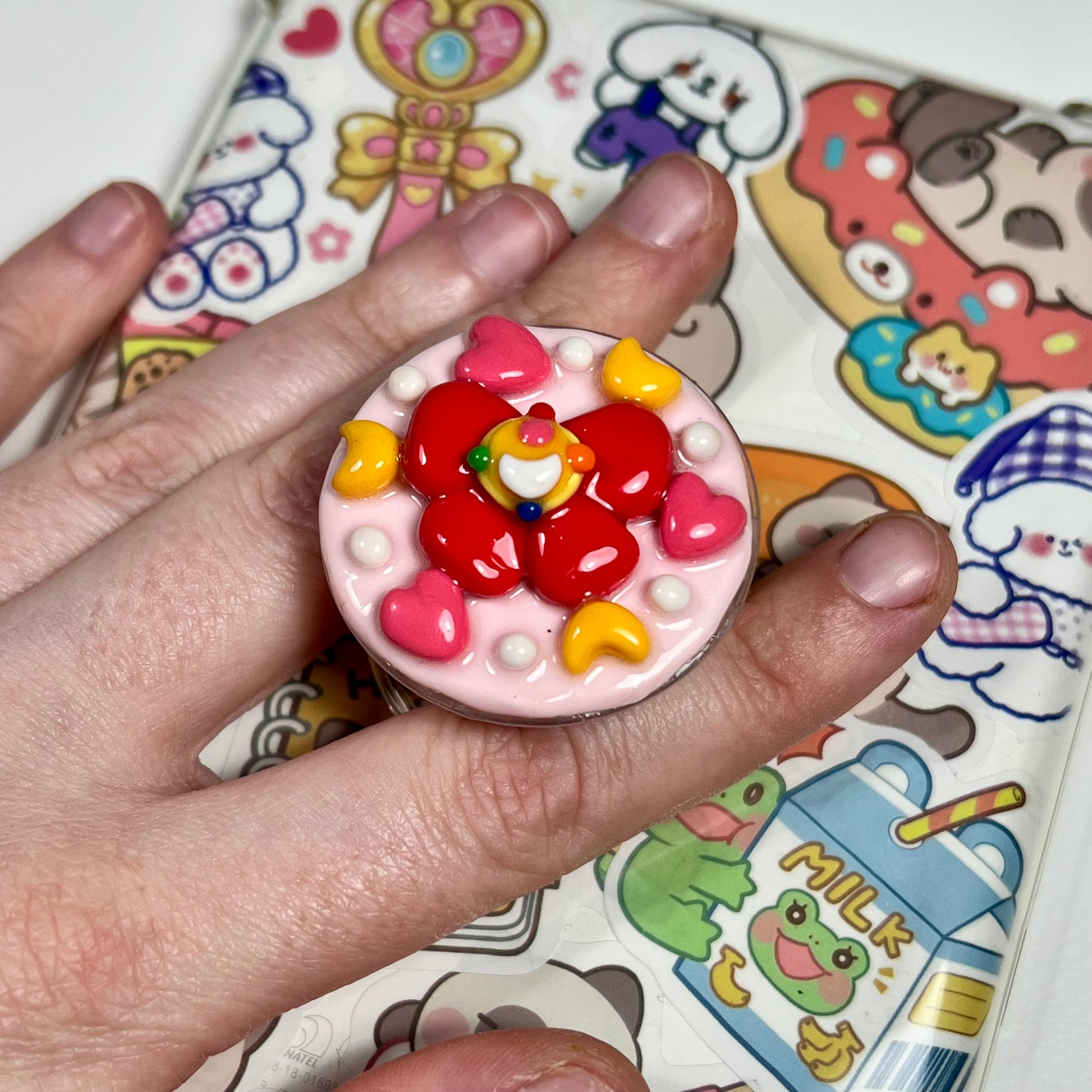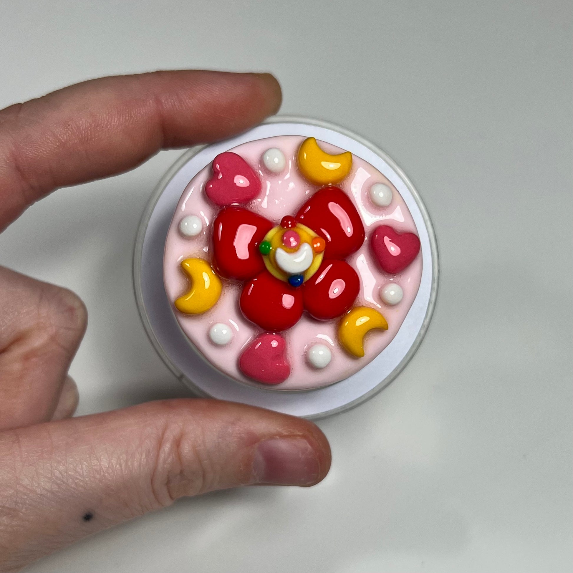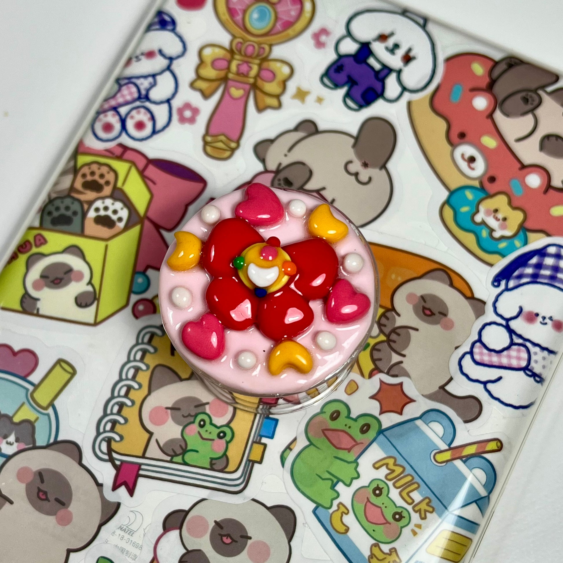 Phone grip o agarre para el móvil inspirado en la esencia de Sakura y Sailor Moon: un accesorio adorable y funcional que añade encanto y magia a tu móvil o libro electrónico. Está disponible con adhesivo y con aro magnético.